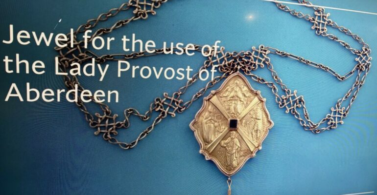 The Lady Provost of the city of Aberdeen, Hazel Cameron, the wife of the Lord Provost Doctor David Cameron and a member of Aberdeen City Council, gave a most interesting talk about her experiences and activities since taking up her post in the summer of 2022. She began her talk by speaking about her chain of office, known as the ‘Jewel for the use of the Lady Provost of Aberdeen’, with the pendant made in gold and commissioned by the wife of Henry Alexander, Lord Provost of Aberdeen from 1932 to 1935. It includes a central sapphire and a pendant pearl, and depicts in relief the saltire and four saints with special significance to the city, namely, St Nicholas, patron saint of the Burgh of Aberdeen, St Clement of Fittie, St Fittick of Nigg and St Machar of Old Aberdeen. On the reverse side is