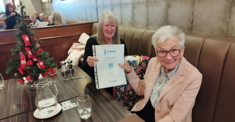 This week at a lunch meeting presentation of a certificate and flowers was made to a club member in recognition of 20 years service to the club. She thanked club members and spoke of the club’s much valued activities and her wish to continue to support it in the future.