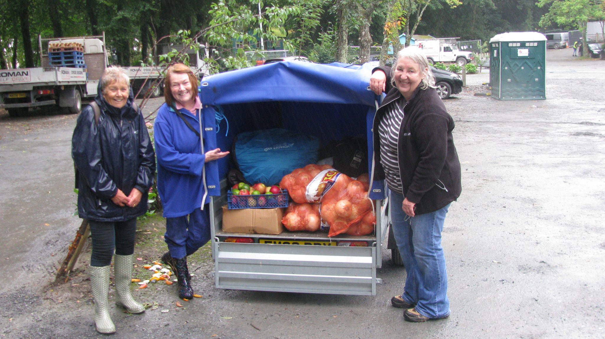 Sian Kent, Gwen Ellis Jones and Andy Hawkins, in wellies and macs, visited Portmeirion after Festival 6 and collected sleeping bags, tents and food, including 4 very heavy sacks of enormous onions, yoga mats, rugs, cushions and umbrellas which St Mary’s Hostel in Bangor gratefully accepted.