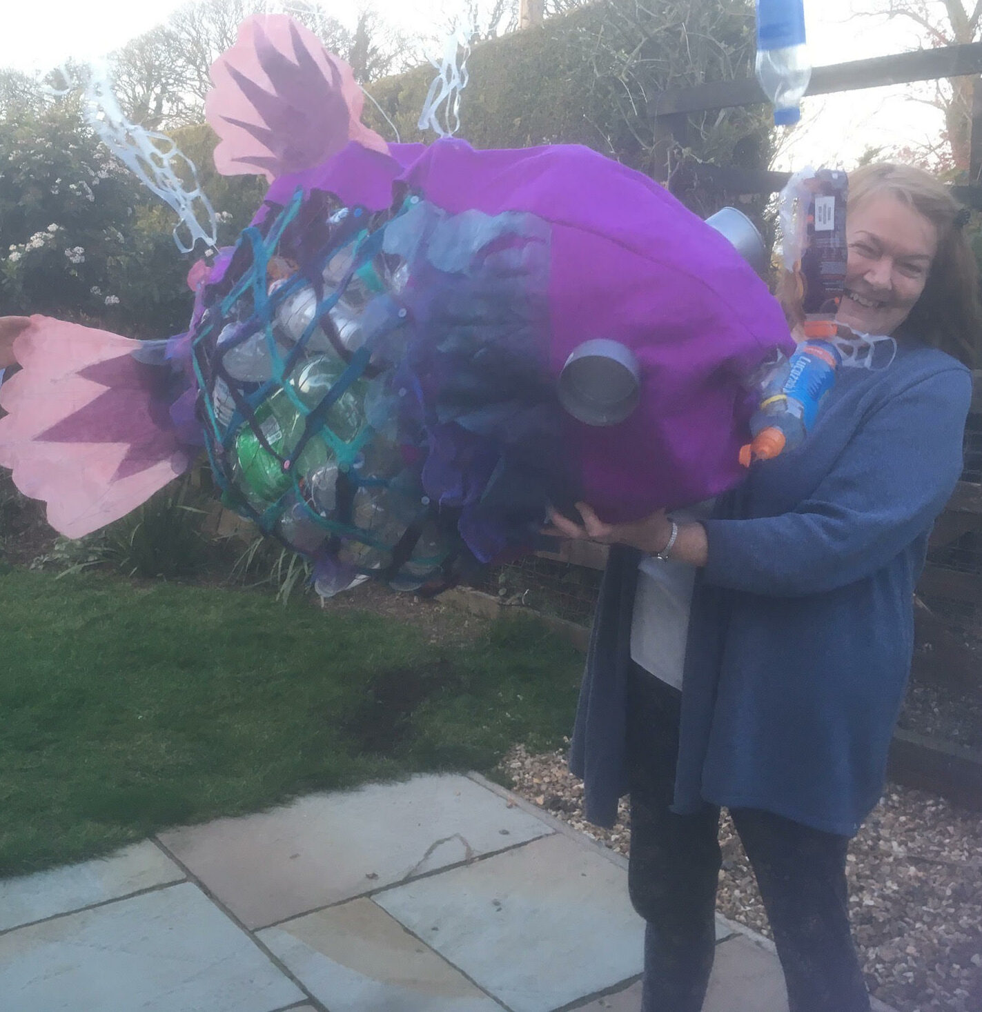 Sian Kent, Programme Action Officer and Maggie Hughes with “Polly de la Mer”, a fish made of rubbish that it might find in the ocean today due to human activity. A spur to action for everyone to reduce, reuse and recycle.