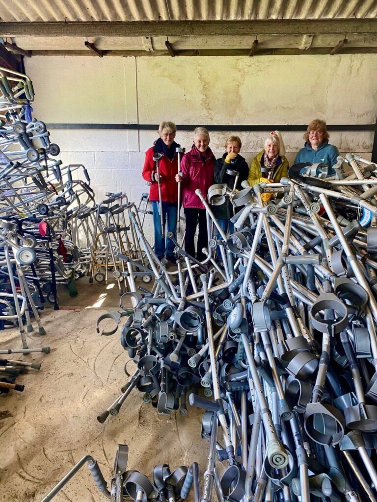 to sort out a veritable mountain of crutches and other equipment. For example we paired, cleaned and sorted the crutches, tying them in bundles of five, in preparation for these to be eventually shipped abroad. There is always a large number of volunteers making it very sociable.