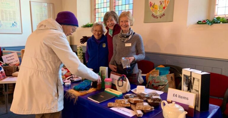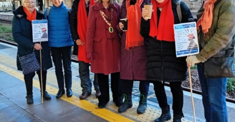 Each wearing orange, six members of SI Bristol caught the train to Weston-super- Mare. On the journey from Worle Councillor Wendy Griggs, Chairman of North Somerset Council, spotted our banners and introduced herself. She remained with us until we joined the rest of the Soroptimists and others outside the station. Where she met up with the Mayor of Weston super Mare for the March. We marched through the shopping area, handing out bookmarks, to Grove Park where we tied ribbons on the railings round the pond. Each of the 110 ribbons represented a death from domestic violence over a year. Other Soroptimists joined us there and there were seven from SI Bristol in total. From there we gathered at the bandstand for speeches about domestic violence and the importance of eliminating it. Two statistics stand out: only one quarter of instances
