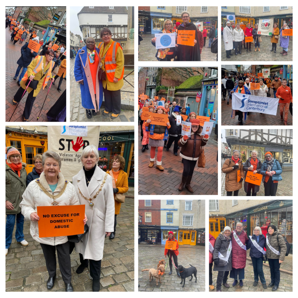 To bear witness to that statistic, and to give an expression for those who cannot, she encouraged everyone, every sort of woman, to walk together silently through the streets of Canterbury. And so, the people wearing orange did walk, slowly, silently through the Saturday crowds, past the shop windows, and the displays, and the theatre and the pubs. The Lord Mayor of Canterbury, Jean Butcher walked with them. And the Lady Mayoress, Diane Baldock walked too. The Soroptimist Region President, Sue Edgar walked as well.