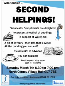 To celebrate International Women’s Day 2026 Cirencester Soroptimists are holding an event called “Second Helpings” to support WaterAid