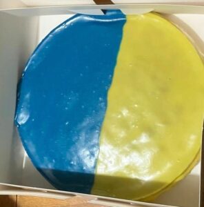 The meal was completed with coffee and a blue and yellow iced Ukrainian Honey Cake donated by the new Phoenix Café in Cirencester.