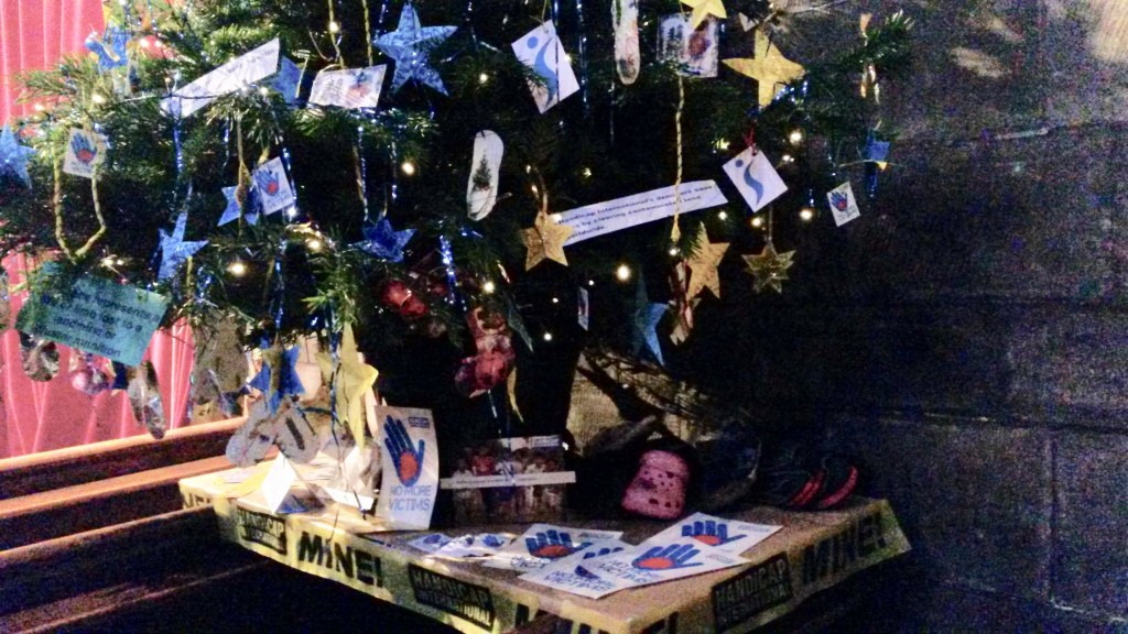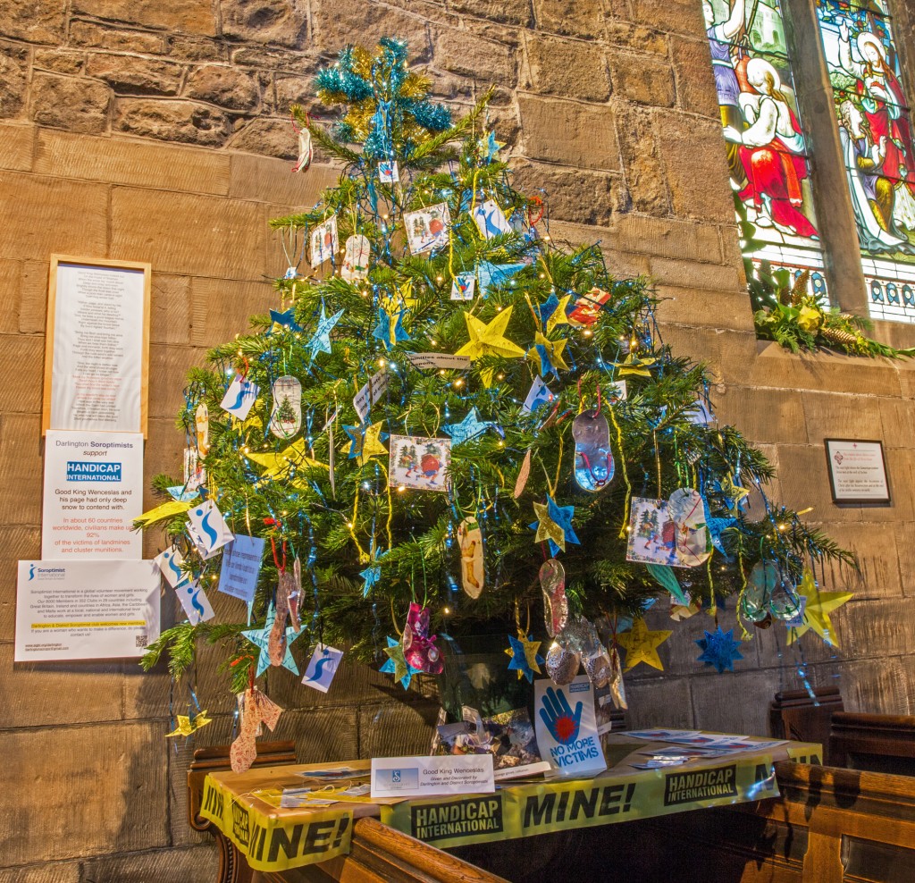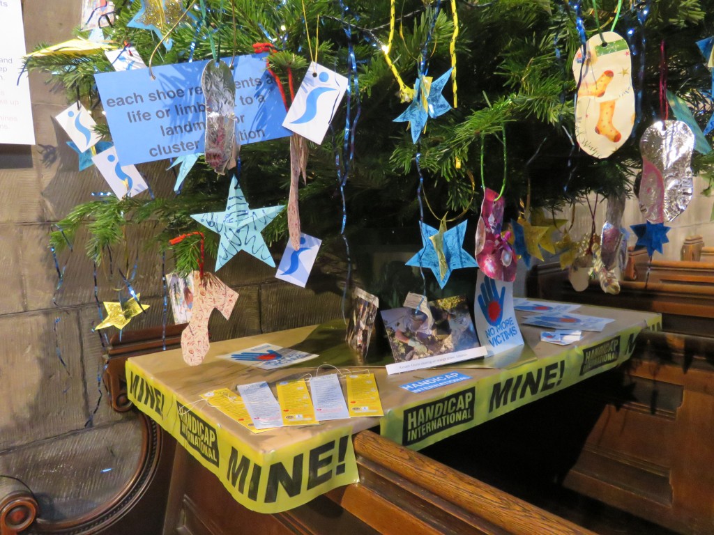 St Cuthbert’s Church, the only Grade 1 listed building in the town centre, is holding a Christmas Tree Festival in aid of its Roof Fund. Our club is represented by a tree decorated in blue and yellow, with information about Handicap International and its wonderful work. Maureen made lots of small paper shoes and flip-flops to hang from the branches; Alma provided yellow shoelaces which make an original sort of lametta; Hilary and Carole S. produced beautiful yellow and blue 3-D stars (with glitter!); Jean made fabric shoes; Barbara worked with Handicap International materials to make things to hang up, and Elizabeth brought real shoes to pile at the base of the tree. The theme for the tree had to be a Christmas carol, so we chose Good King Wenceslas, and made a comparison between the king’s struggle through the snow, followed by his page, with the risks faced by civilians in areas of unexploded munitions. A bit tenuous – but we hope it gets the message across.