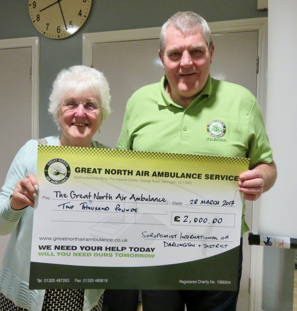 Steve Cooper, a volunteer with the Great North Air Ambulance Service, gave a presentation which updated us on the wonderful work done by this year’s President’s Charity. The charity is funded entirely by the public; it has no government funding whatsoever. Steve gave us statistics from the year 2015-2016 which showed that the majority of incident locations (43%) were in Cumbria, the rest being throughout the North East from North Yorkshire up to Northumberland. Most of the incidents were road traffic collisions and medical emergencies; other cases involved falls, sport and leisure, and industrial accidents, among other things. The helicopter currently based at Durham Tees Valley Airport is hoping to move to a purpose-built site at Urlay Nook. A second aircraft is based near Penrith and a third is used for spares. On board there is a pilot, a paramedic/navigator, a doctor and space for one patient. For the last 18 months blood has been on board, which has saved even more lives. There is also an amputation kit. The aircraft is “A & E plus a propeller”. We were shown the stories of survivors, many of whom would not have been here to tell the tale if there were no GNAA. Steve talked about their sources of income: the main one being donations. After questions and answers, President Alma presented Steve with a cheque for £2000, raised at various events during the last year.