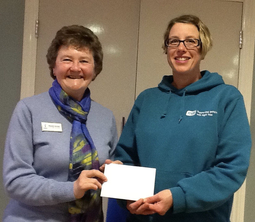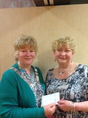 Maureen Gorman and Helen Rogers Maureen Gorman introduced the speaker, Helen Rogers, the area fundraising manager for the RNIB (Royal National Institute of Blind People). In her introduction, Helen described the difficulties some members of the public face in distinguishing between the RNIB, the RNLI and the RSPB. This can result in some amusing phone calls. She also told of her experiences wearing the RNIB’s Sooty costume, which is very hot, at fund-raising occasions. Helen gave a lively and informative talk about how the organisation supports those living with sight loss “to give people what they need to get on with enjoying life”. It gives practical and emotional support, and also campaigns to raise awareness among groups such as MPs and bus drivers. The RNIB launched Talking Books in 1935 and has its own recording studio in Camden, with another planned in Gateshead. The service is absolutely free to its users and fundraising is vital to cover the production costs of the books, which are available in different formats. Each adult book costs £2,500, and each children’s book costs £1,500. Only about 8% of blind people read Braille, and Talking Books are needed and valued. For example, they enable grandparents to share books with their grandchildren, and help prevent people with sight loss from feeling isolated. Helen was presented with a cheque for the RNIB at the end of her talk.