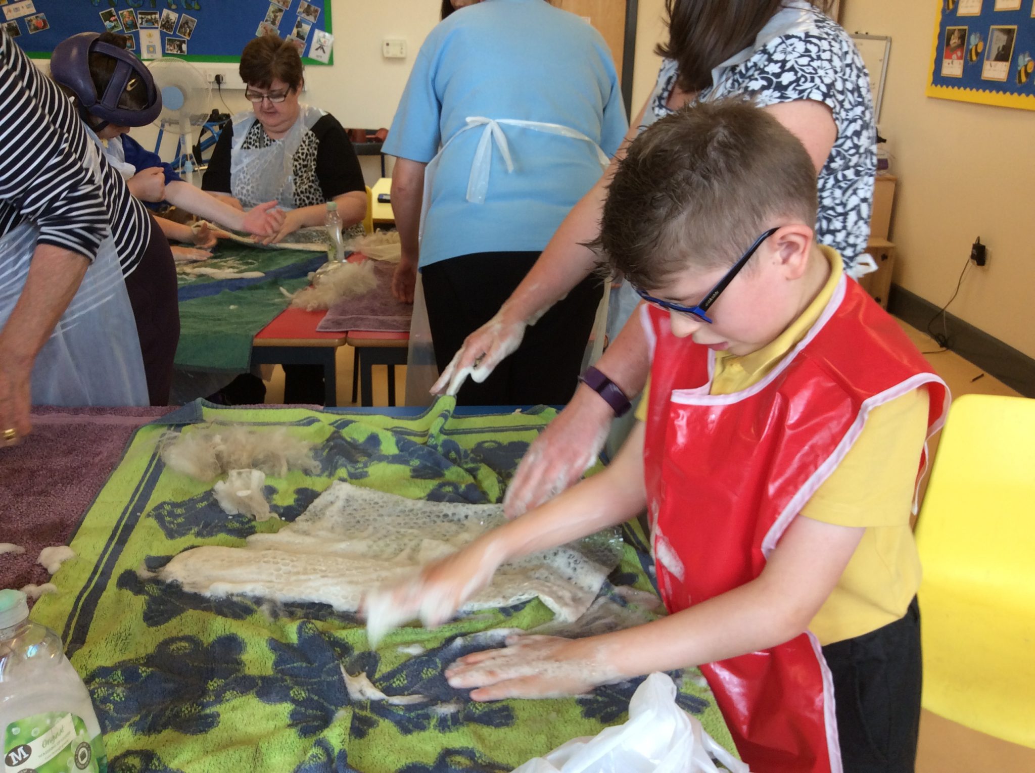 One recent activity involved SID’s first sheared fleece, several members of S.I.Durham, the children at Evergreen School, a lot of warm water and some washing up liquid! We had a felt-making session at the school in the summer term. The children very much enjoyed laying out the fleece, getting wet and soapy and creating beautifully soft felt which they can use to make pictures and cards.