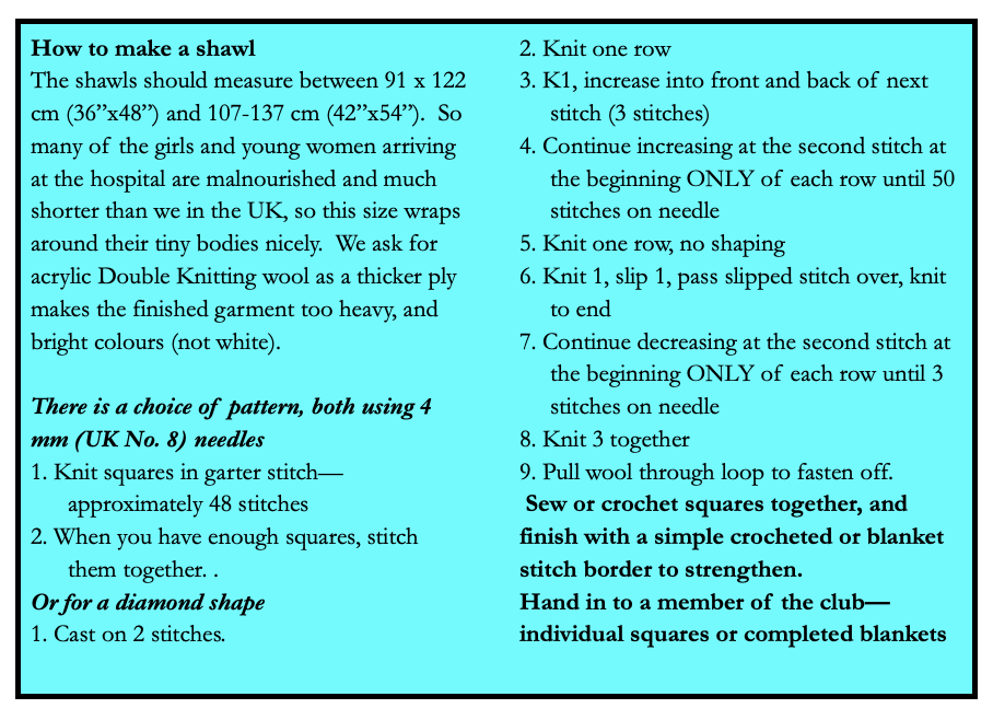 These days its tempting to expect women to sail safely through the process of giving birth and should anything go amiss, that they should receive prompt, effective and compassionate after care. Sadly this isn’t always the case. Which is why Grange-over-Sands have taken up their needs in support of Knitted with Love. This is a campaign run by the Hamlin Fistula Hospital in Addis Ababa, Ethiopia, providing shawls for women and girls who come for treatment for devastating injuries as a result of childbirth. They’ve endured a prolonged and agonising obstructed labour, often lasting days and without medical support. Most have gone on to suffer the heartbreak of losing their baby. They have then been left with a debilitating and painful childbirth injury, such as obstetric fistula, causing them to leak urine and sometimes faeces. By the time these women arrive at a Hamlin Hospital, they have been shunned, stigmatised and shamed for months, years, even decades. Receiving a shawl helps women to know we care and is a beautiful and effective way to support them on their journey to full recovery, one that frequently requires extensive surgery.