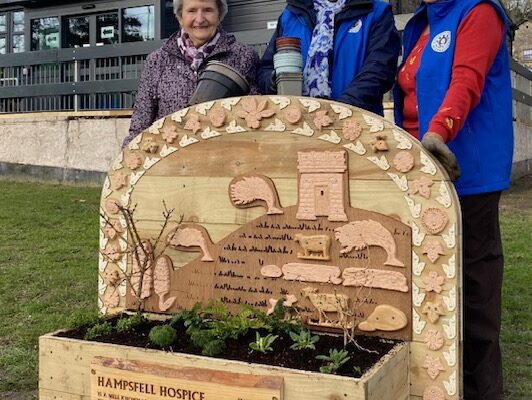 A story trail round the library? What a great idea! Grange-over-Sands have tended the flower beds there for many years, and even provided benches to sit on. So we were delighted to be invited to be involved with planting plans that involved local history as well. We quickly learned that each planned new bed would tell a different story. Some would involve local people and some local legends. And with as the seasons changed, and the planting changed to match, so the story boards at each one would change to tell a different tale. Our team of experienced gardeners were joined by our new member Jeni McConnell. Jenni’s experience as a socially engaged artist in areas rural and urban gave rise to great new ideas. The result? A trail which encompasses the work of local artists, gardeners and school children, and brings the past into
