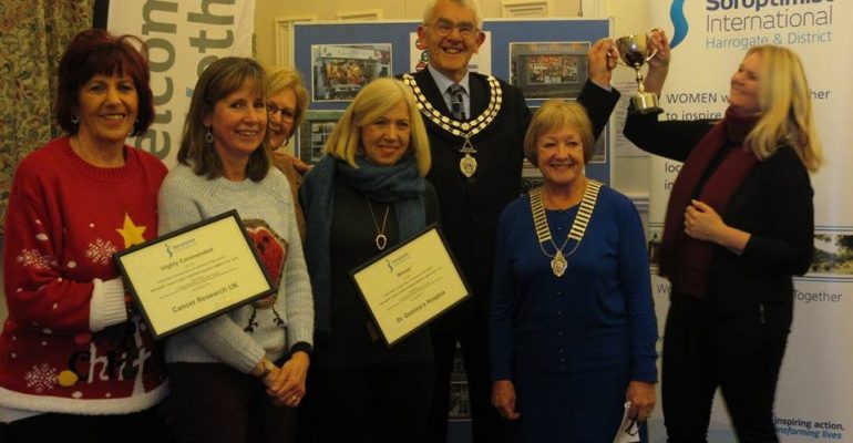 Club members Celebrated reaching our target and more by raising £3500 for the Meru Women’s Garden Project in Kenya. This is equivalent to providing the resources to establishing twelve gardens.We were delighted to welcome three prospective members and enjoyed an excellent supper meeting at the White Hart Hotel on 6th February. The Club’s three year project to support our Federation project included raising funds and awareness in many different ways to support women and their families in Meru Kenya .The ladies in Meru have developed sustainable market gardens producing food for their own families and extra produce to raise family income. The project has also introduced education programmes for girls and boys with the aim of stopping Female Genital Mutilation (FGM), still widely practiced in this part of Kenya though illegal. The picture shows Soroptimist Penny Broadley, Joint President Hilary Waddington, Soroptimist Val Hills and
