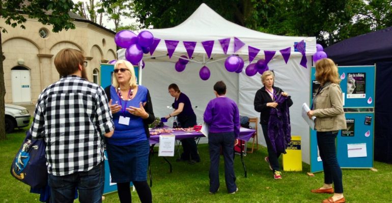 Kenilworth Soroptimists, together with sister clubs in Coventry and Leamington & Warwick, enjoyed warm sunshine while welcoming the crowds to their eye-catching stall at the Peace Festival last weekend. Purple balloons and bunting drew visitors to the stand to find out more about the work of Soroptimists’ Purple Teardrop campaign; ‘Stop Human Trafficking’. The Soroptimists drew petitioners’ attention to signs of trafficking such as several women living in run-down, usually rented accommodation, never alone when seen outdoors, and premises frequently visited by different men. Kenilworth Soroptimists were delighted by festivalgoers’ support of Purple Teardrop’s work in helping vulnerable victims of human trafficking into the UK. ‘By the close of the festival we had collected over 1000 signatures for our petition to outlaw sex for sale advertising’ said Patricia Weinbren, President of SI Kenilworth. ‘We want to say a big thank you to the public for