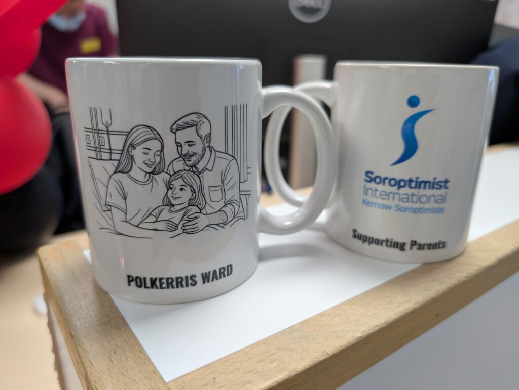 Kernow Soroptimists have started a project to support families who need to stay in the Polkerris Children’s Ward at the hospital in Treliske, Cornwall. This followed two emergency admissions for a family of one of their club members. We became aware that the circumstances in which parents (often mums!) end up on the ward, mean that they do not have anything that they need for their personal care. In addition, parents do not want to leave their children to go to the hospital shop, which is at the other end of the hospital. Currently, the club are working with staff to identify ways in which the stay for parents could be made more comfortable. The project kicked off with some newly designed mugs being presented in December. These mugs have the ward name on them and so they should easily find their way back to the ward’s parent kitchen. The club are currently looking for donations of toiletries to make up ‘overnight bags’. If you think that you could help please message us on our facebook page.