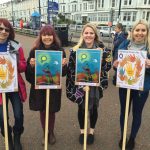 On Saturday 11th March, we celebrated International Women’s Day with a Walk along the Promenade In Lldndudno. We had a great time, We assembled at the Imperial Hotel for coffee and sorting out the placards. The weather was kind and we were able to collect lots of signatures for our petitions. 45 people signed the petition for Handicap International against cluster bombs. 81 signed to Por;ple teardrop campaign petition against Human Trafficking. The mayor of Llandudno, Carol Marubbi, joined us, as well as other local councillors, a policeman and even some birds of prey!