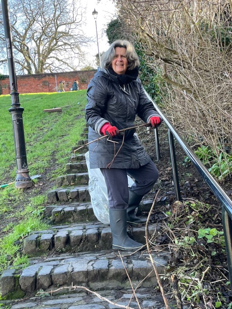 On arrival various tasks were allocated including working on the newly planted hedgerows, and litter picking. We opted to clear the areas at the side of the steep, flight of cobbled steps ( more than 90..!!) at Churchfields. Armed with tools, and ‘Great British Spring