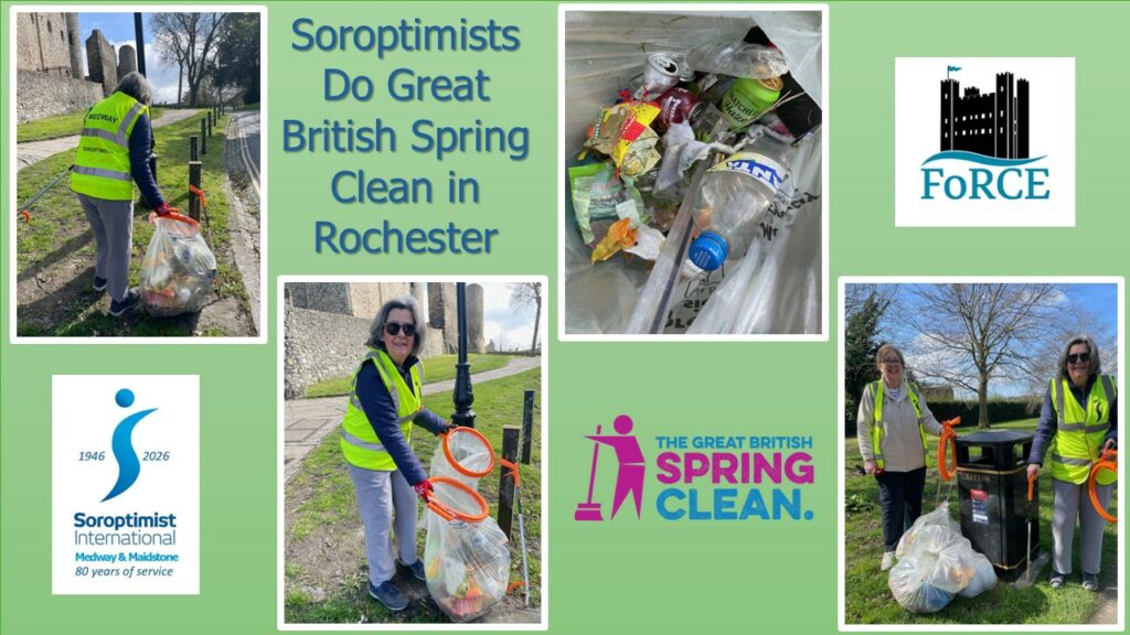 Members of Medway and Maidstone Soroptimists joined in with other volunteers from Friends of Rochester Churchfields and Esplanade (FoRCE) to do a litter pick along Rochester Esplanade on 21 March as part of Great British Spring Clean. We covered a distance of 2.3km collecting discarded rubbish using pick-up sticks and bags provided. Types of rubbish collected included drink cans, food takeaway cartons, plastic bottles and cigarette butts.