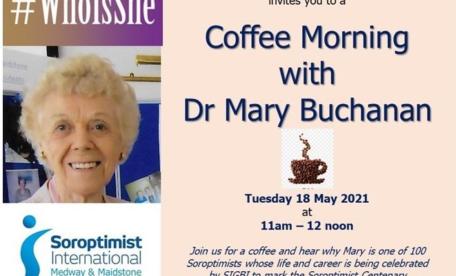 Carol Infanti has organised the next Club Zoom Coffee Morning with Dr Mary Buchanan on Tuesday 18 May 11am- 12pm. Mary is an honorary member of SI Medway and Maidstone and has been a Soroptimist since 1967 when she joined SI Maidstone. She has held leadership roles at local, national and international level. In 1991 she was Chairman of the Soroptimist International Convention We were delighted that Mary was selected to be one of the 100 women whose life and career are being celebrated by SIGBI to mark 100 years of Soroptimist International. #Whoisshe https://sigbi.org/soroptimistcentenary2021/files/13.-Dr-Mary-Buchanan-1-1-1.pdf Mary has kindly agreed to talk about her work and career including her role as President of EUROPA DONNA, setting up a Well Woman Clinic, an Adolescent Clinic and Cervical Screening Clinic and much more.