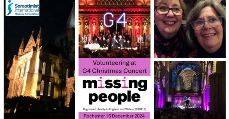 Three members of Medway and Maidstone Soroptimists volunteered on behalf of Missing People UK at the G4 Christmas concert on 16th December at Rochester Cathedral. Acting as ushers, showing guests to their seats on arrival as well as giving out event programmes. We helped to collect donations at the end of the night, standing with a bucket as guests leave. It was a fun evening with everyone getting in the Christmas mood. Missing People is an independent charity funded by donations. It is the only lifeline for missing people and their families in the UK. It provides specialist support to people who are missing or at risk of missing, and the families and friends left behind. Someone is reported missing every 90 seconds in the UK. That means life is lonely, scary and uncertain for 170,000 families every year. A message from Missing People, ‘Thank