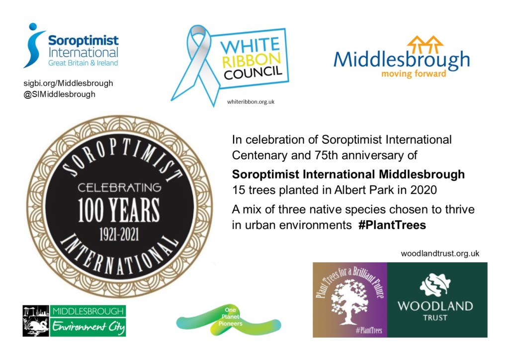 We have planted 15 urban trees in Albert Park, Middlesbrough, on 24 November 2020, to celebrate 75 years of SI Middlesbrough and 100 years of Soroptimist International.