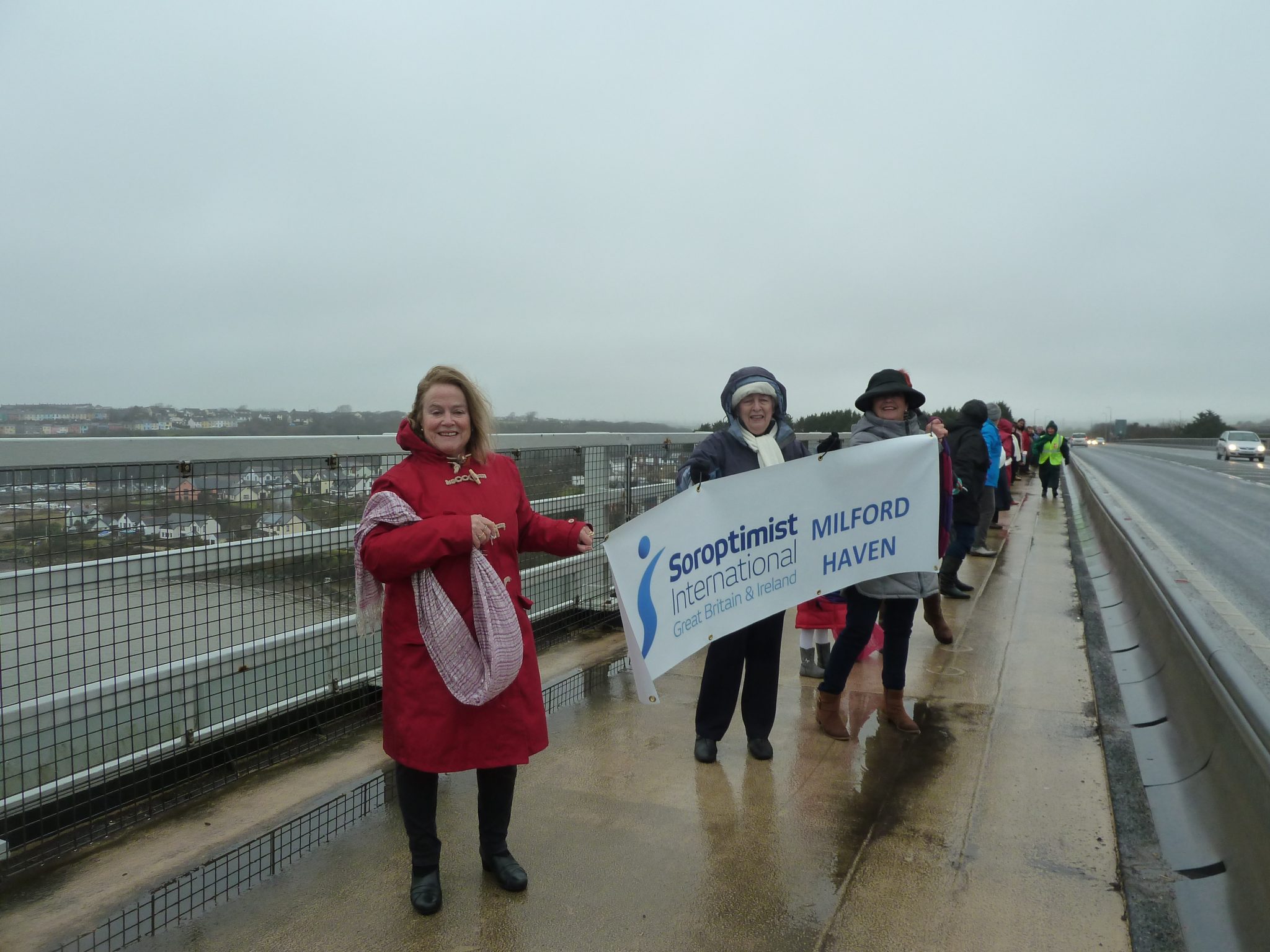 Soroptimists, friends of Pembrokeshire Women’s Festival and the SGI Buddhist group met on the Cleddau Bridge to celebrate International Women’s Day. It was cold, wet and windy but that didn’t stop over 100 women holding hands walking along the bridge to the accompanying sounds of Samba Doc drumming band.