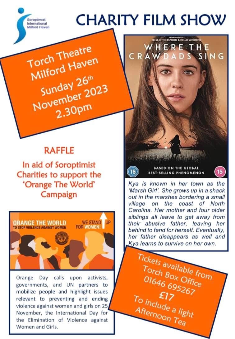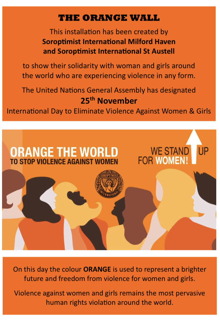 Milford Haven Soroptimists have created a mural of hand-made flowers, with help from Soroptimists in St Austell in Cornwall, their frienship link club. The mural is composed of over 600 orange flowers. It is currently hanging up in the Torch Theatre where a Charity Film event is being held on 26th November. Orange is the colour adopted by the United Nations in their campaign to Eliminate Violence Against Women. The 25th November has been designated as a special day each year by the UN.