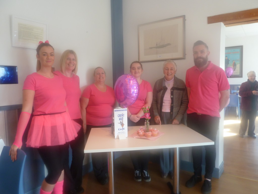 The photograph shows SI President, Erene Grieve, with the staff of the Crow’s Nest café on Milford Marina where the staff (even the men) all dressed in pink, decorated the tables with pink serviettes and sold pink iced cup cakes for the charity- a great effort.