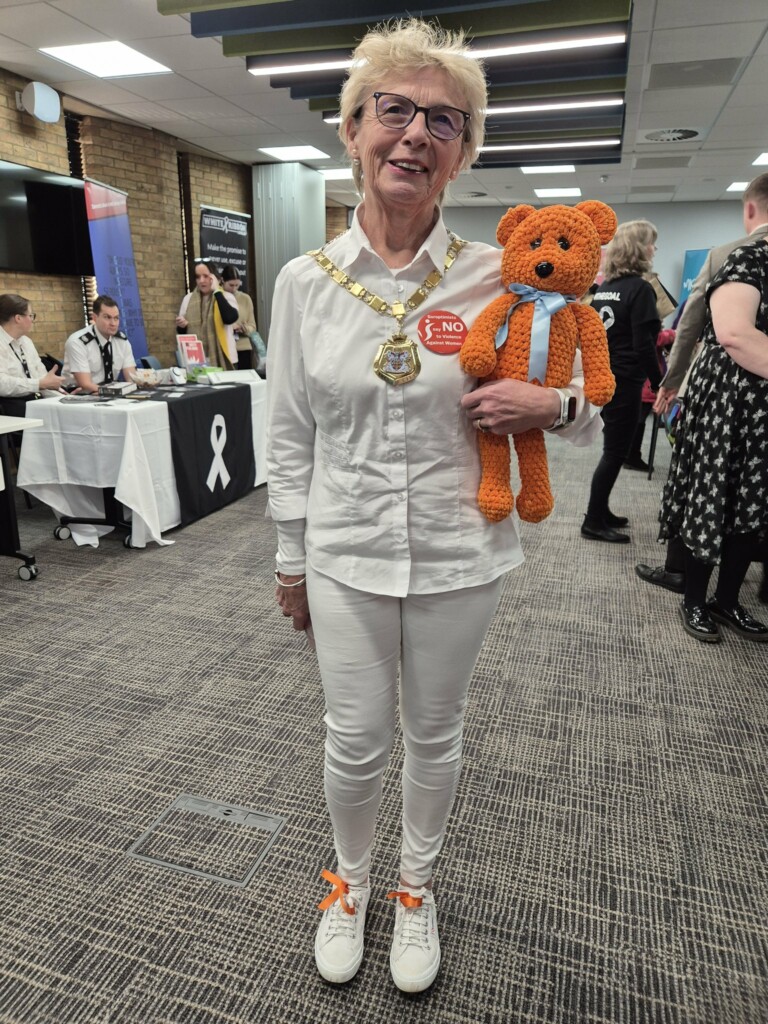 This year, again, we supported two important events as well as our monthly Orange Cafe at Dobbies. On Monday 25 November, during the day we set up our Orange the World stall at Milton Keynes City Council offices at an event to raise awareness with staff about the campaign, the issue of violence against women and to highlight the services that are available. We were there alongside other agencies including Thames Valley Police, MK Act and SASSMK and we even got the Mayor to give our Orange Bear a hug and wear orange show laces for the rest of the day. We then took part in the Annual Vigil, we helped to organise. To learn more click here The event started at MK Gallery and this year’s speakers were Men, encouraging them to recognise the issues and help to change attitudes and it included one speaker giving a personal account of knowing someone in an abusive relationship and the difficulties of how to help. It was great to see the sky room full, there were over 100 people there wanting to know more and they walked down to MK Rose and the International Women’s Day Column for a moments contemplation and to make a pledge to do what they can. The 90 Orange hearts we made were handed out to people as they came into the gallery and at our stall set up to highlight the issues we were able to raise £35 in donations for MK Act. And we must thank Hotel LaTour, who were lit up in Orange. The colour orange is used to symbolise a brighter future, free from violence against women and girls. Soroptimists around the world want to get more buildings lit up Orange to raise awareness so thank you Hotel LaTour and we hope you will light up again in orange next year.