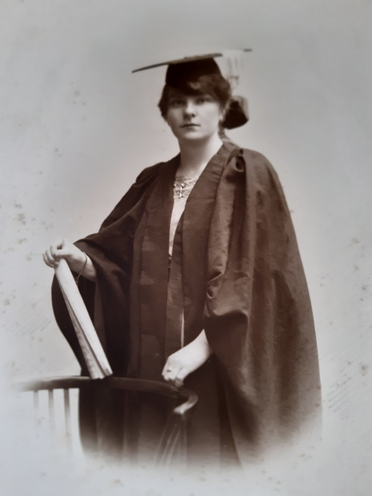 So, I take up their challenge and submit a photograph which I know will be 100 years old next year. Dated December 1921, it is a photograph of my Mum, Dorothy Bower, aged 18 when she received her Associate of the Musical International College in Piano and Singing. Maybe this is not a fashion statement but it is a documented event that fits the timeline.