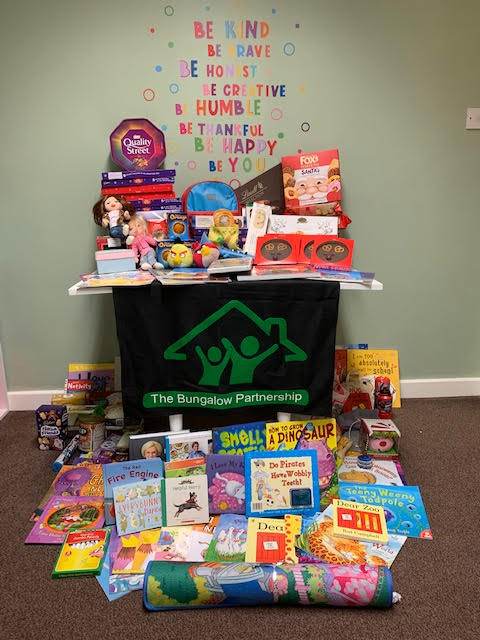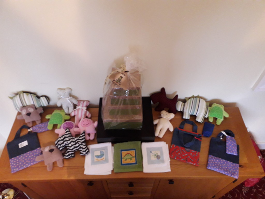 SI Middlesbrough continue their excellent work supporting The Bungalow Project which I have reported on previously. They have donated canned and dried foods plus colouring books and pencils [Photo 2] for clients. Delivered by Geraldine Nuttal, they were gratefully received by Lyn, the Business Manager, who said they would make a massive difference to their families. This was followed up by a further four bags after the photograph was taken. Shirley Bond completed her promised supply of Teddies adding 24 to make a total of 42 for Christmas gifts. [Photo 3] shows The Tower of Temptation containing sparkling wines and three types of chocolates. Other items are beautiful little toys, bags, appliqued face cloths donated by Helen, the owner of a local shop – Tilly’s Barn. This was a single quite large donation, and the Bungalow Project can decide whether to raffle or split into individual boxes.