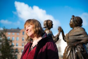 For May, our first pair of amazing women is Rachel and Judy. RACHEL CARTER (photo on left, below) is the sculptor of ‘Standing In This Place’, a bronze statue recognising the legacies of the transatlantic cotton workers, installed in the heart of the rejuvenated Broad Marsh area in Nottingham City Centre. JUDY ROBINSON (seen on left of second photo, below) is a member of Soroptimist International Nottingham, campaigner for more representation of women in public art and the model for one of the figures.