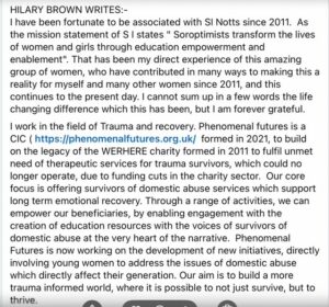 As a Soroptimist I have helped clear and replant the overgrown garden at WeRHere, a counselling service for women and families. I now regularly maintain the garden there for Phenomenal Futures and through these organisations I met the dynamic, wonderful and caring Hilary Brown.