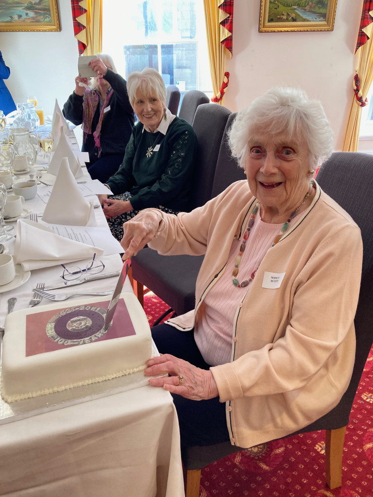 Our Christmas lunch was unfortunately cancelled because of Covid problems, and it wasn’t until 22nd February, 2022 that we were able to meet up to celebrate the Festive season.  We met in the Royal George for a delicious lunch, much enjoyed by everyone.  Our official Centenary Cake was cut by our oldest member, Nancy.