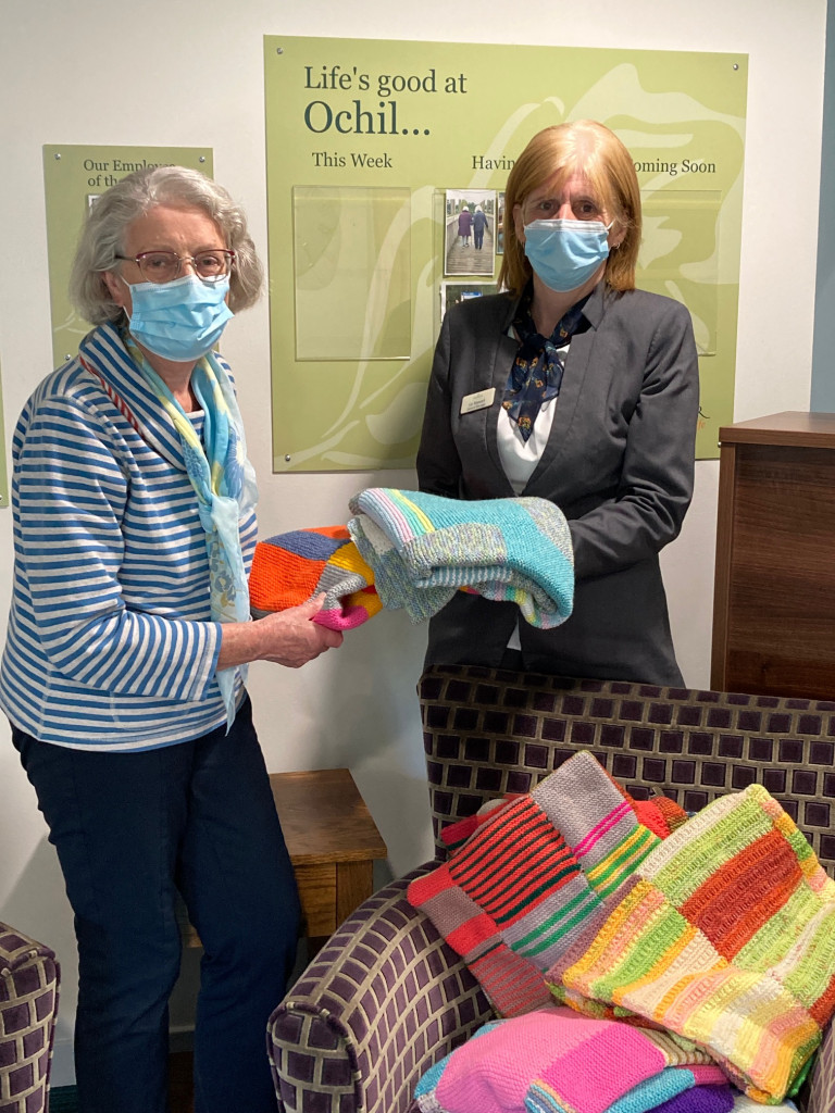 SI Perth Members have been busy knitting cosy knee blankets which were handed over to residents of Ochil Nursing Home in Ettrick Drive, Perth.