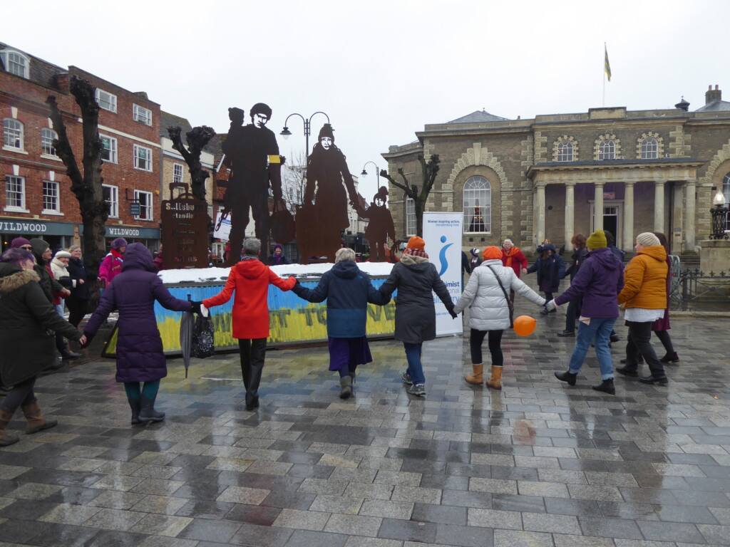 Despite a snowy start, followed by rain, a hardy bunch of Soroptimists gathered in Market Square to celebrate International Women’s Day. We were joined by the Mother’s Union, a delegation from Godolphin School and some other women.