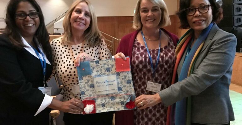 SI San Fernando are celebrating their 60th anniversary! They asked clubs around the world to contribute to a peace patchwork by creating a 12 inch square patch. Our member Annie Hotton stepped up to create this patch. The martisor represents our link to sisters in SI Chisnau, Moldova. SI Salisbury members Bernie and Eleanor handed over our club peace patch to Renata and Sandra from SI San Fernando at the SIGBI conference in Belfast.