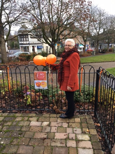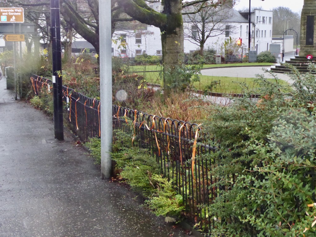 Blairgowrie Soroptimist, Jean Campbell, was keen to raise awareness about the issues and involve the local community, noting that orange is the colour chosen by the United Nations as a bright and optimistic colour to represent the campaign. Jean involved friends, family, local councillor Caroline Shiers and her daughter to attach orange ribbons & posters on the railings around the Wellmeadow (centre of Blairgowrie) and she asked shops to add an orange item / theme to their window displays along with posters & balloons for the 16 Days.