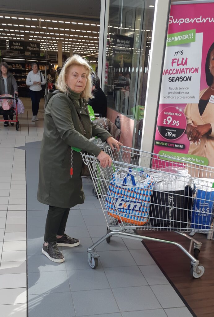SI Hamilton member Betty arriving at Superdrug, Newton Mearns, with collection of blister packs for recycling for Marie Curie.