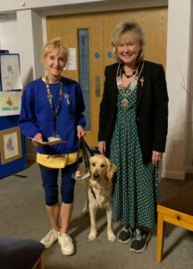 SI Sevenoaks President Margaret Crabtree handing over a cheque for £1,000 to Irene Collins of Guide Dogs, pictured here with trainee guide dog Rhubarb who behaved impeccably throughout the meeting.
