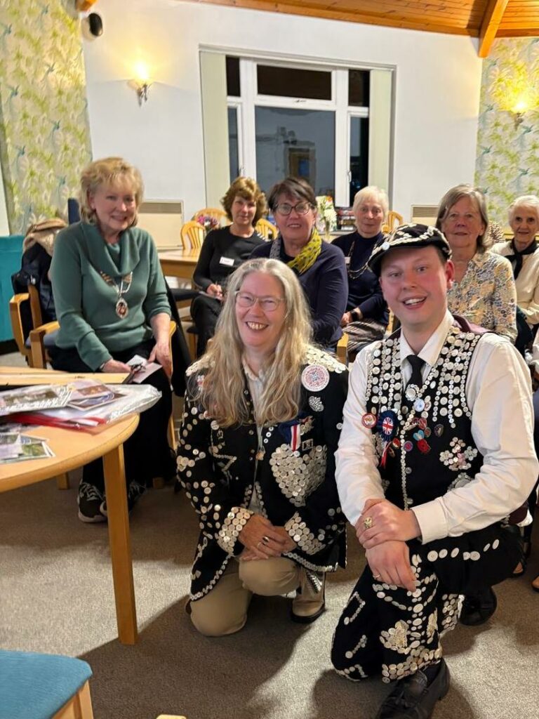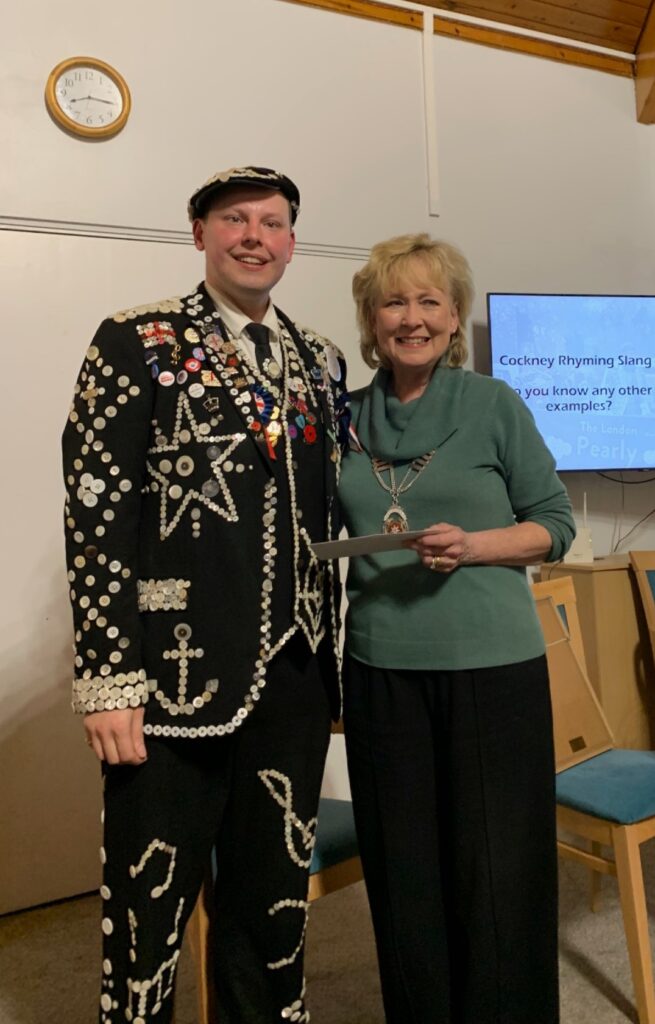Photographs: President Margaret Crabtree presented Chris with a donation; Past President Penelope Robbins who had invited Chris to be our speaker for the evening, trying on the Pearly King jacket which was very heavy with all the buttons sewn on!