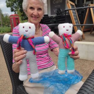 SIGBI Head Office were contacted by a post-graduate student from India called Nupur Gill, who wanted to meet Shirley Brigham of SI Sevenoaks to see her knitted teddies and talk about their distribution. Nupur is studying in London and she travelled down to Sevenoaks with a friend to meet Shirley and the teddies. Nupur was very interested to know where the teddies had been sent and Shirley advised to local schools and hospitals and to local police forces as trauma bears and also to Ukraine for the children there. In fact, UNESCO are collecting a further 60 teddies to be sent out to Ukraine shortly! Shirley, who had her 90th birthday earlier this year, has knitted over 780 teddies; she has had some arthritis in her hands but plans to take up her knitting needles again very soon! She is hopeful that when things are calmer some of her teddies might find their way to the Gaza Strip to comfort children there. SI Sevenoaks are very proud of Shirley! What a star she is!”