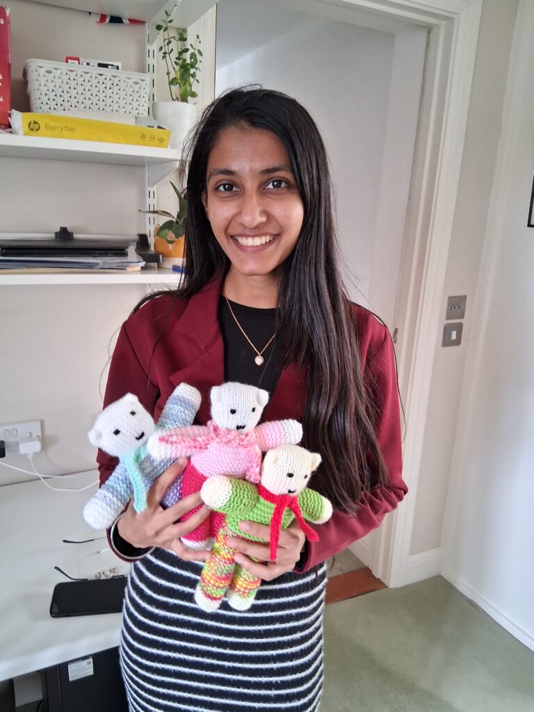 SIGBI Head Office were contacted by a post-graduate student from India called Nupur Gill, who wanted to meet Shirley Brigham of SI Sevenoaks to see her knitted teddies and talk about their distribution. Nupur is studying in London and she travelled down to Sevenoaks with a friend to meet Shirley and the teddies. Nupur was very interested to know where the teddies had been sent and Shirley advised to local schools and hospitals and to local police forces as trauma bears and also to Ukraine for the children there. In fact, UNESCO are collecting a further 60 teddies to be sent out to Ukraine shortly! Shirley, who had her 90th birthday earlier this year, has knitted over 780 teddies; she has had some arthritis in her hands but plans to take up her knitting needles again very soon! She is hopeful that when things are calmer some of her teddies might find their way to the Gaza Strip to comfort children there. SI Sevenoaks are very proud of Shirley! What a star she is!”