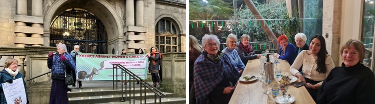 As part of International Women’s Day, eight of our members took part in the Violence Against Women and Girls (VAWG) vigil on Sheffield Town Hall steps. Chris spoke movingly to the gathered participants who represented several groups. Afterwards our eight thawed out with an early supper.