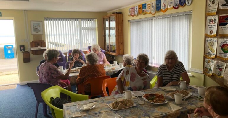 As a club we don’t meet in August, but there is still plenty going on. One member of the club hosts a barbecue at her home, which this year was enjoyed by 24 guests. They raised a total of £410 for our charities. Then we play hostess to 2 local groups from Re-Engage, formerly Contact the Elderly, at the Wheelhouse in Hill Head. A team of 8 (Alison, Rosemary B and Tracy in aprons, and Margaret, Carolyne, Pam, Pauline and Christine) worked hard to lay up tables with a delicious tea and serve the assembled company of about 20, including drivers. The day was gloriously hot, which unfortunately meant the coastal car parks were full to overflowing, but everyone got there in the end. There was even enough for a going-home-plate, as a “doggy-bag”, and a chance to sit outside in the sunshine afterwards.