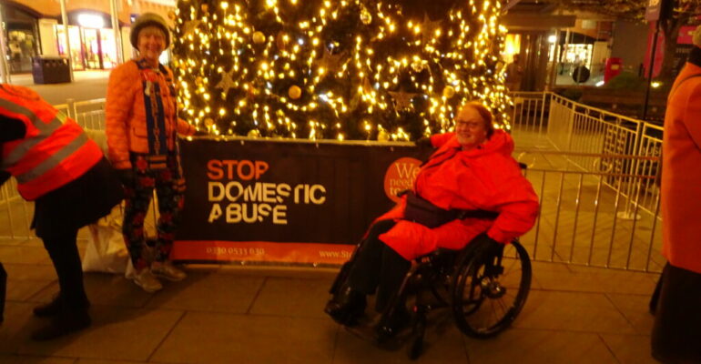 Last night club member Ros attended the Orange thee World event at the Spinnaker Tower. She met up with Julie, from SI Winchester, who was also there to lend some support. The event was more high profile than before, with a community choir singing a range of songs. SDA members were there in force, as were ladies from Cosham Inner Wheel, who were wielding collecting tins. Both groups were handing out leaflets so awareness was raised! The photo shows Ros and Julie by the SDA banner, and one of the Tower in all it’s orange glory. Ros had taken the opportunity to wear her new orange dry robe, but thinks it’s unflattering: she said “… it makes me look like an orange caterpillar (I just hope there’s a butterfly inside!).”