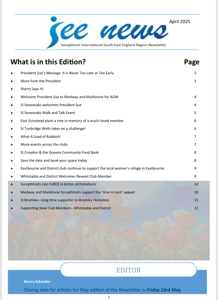 ‘I am happy to meet you all through the pages of this issue. I hope you find the newsletter fun and interesting. Thank you all for the enjoyable reports, stories and pictures you share every month. I joined Soroptimists in 2023.