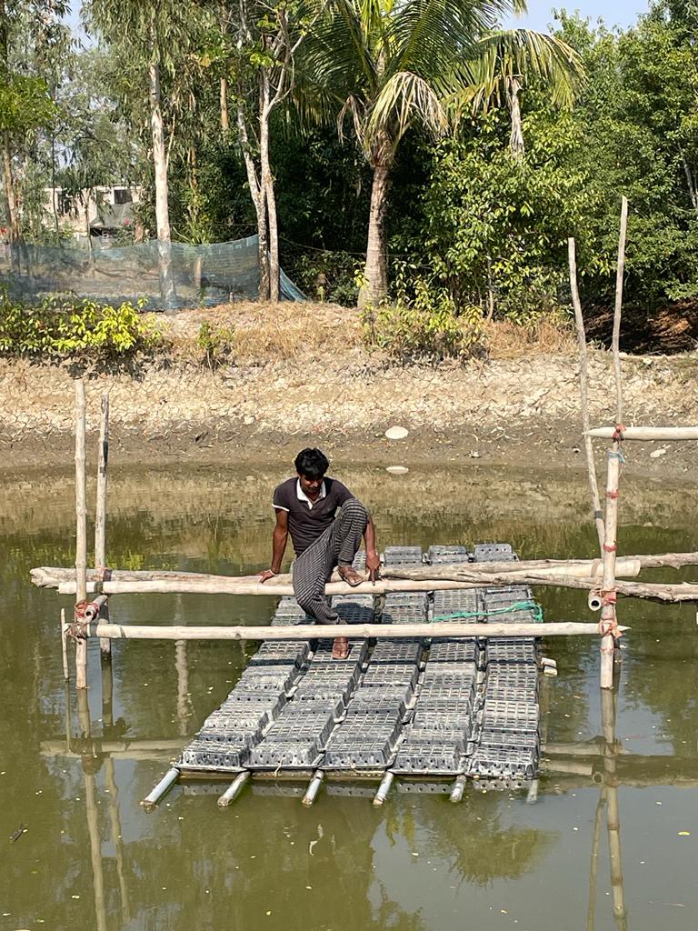 We found the whole-lot of 100 boxes each containing a single crab floating on a makeshift platform in a pond nearby. They have been recently shifted from the creek where they were earlier located.