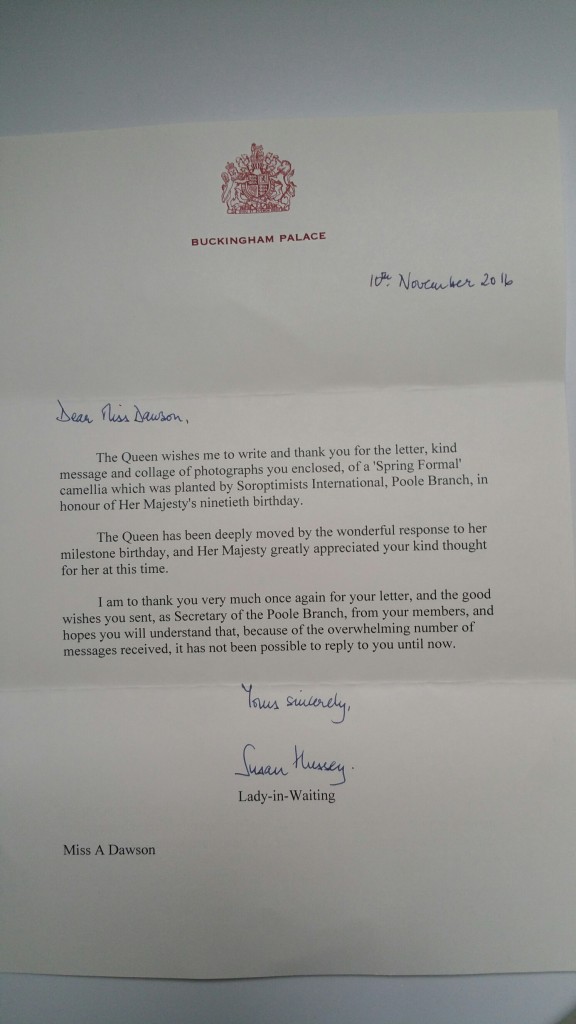 Following on from the planting of a camellia at Soroptimist House, Poole, to mark the Queen’s 90th birthday (see the story in the link below), the members of SI Poole have now received a letter and photo from the Queen, thanking us for our good wishes.