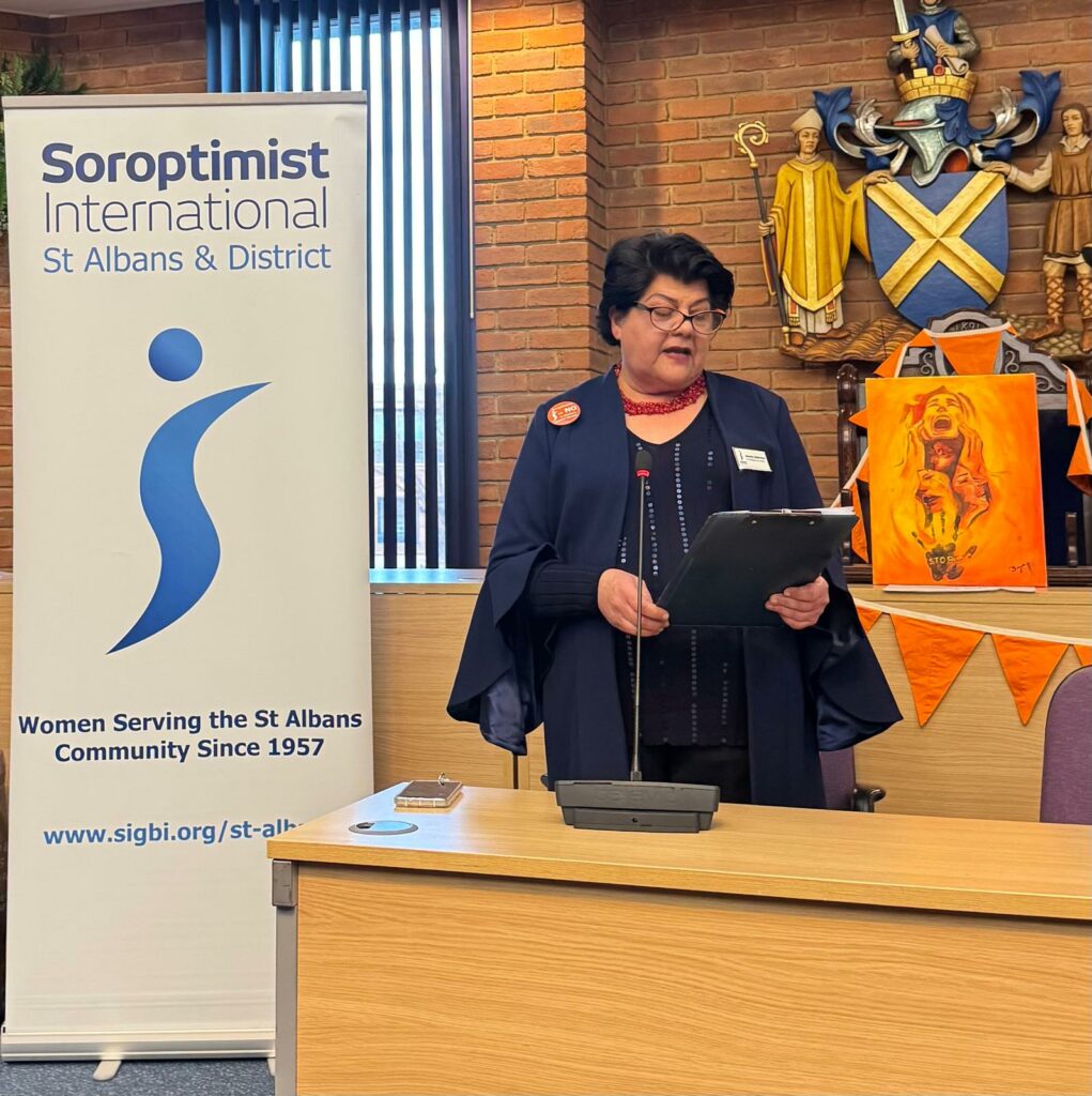 Council’s Leader; The Very Rev’d Jo Kelly-Moore, Dean of St Albans; Emma Robarts, Deputy Lord Lieutenant of Herts and DCI Mike Birch Herts Constabulary. Soroptimist Ameeta Sabharwal led the proceedings saying “Violence against women and girls is not a distant issue; it is here, it is now, and it affects our communities deeply. Here in Hertfordshire, thousands of incidents of domestic abuse are