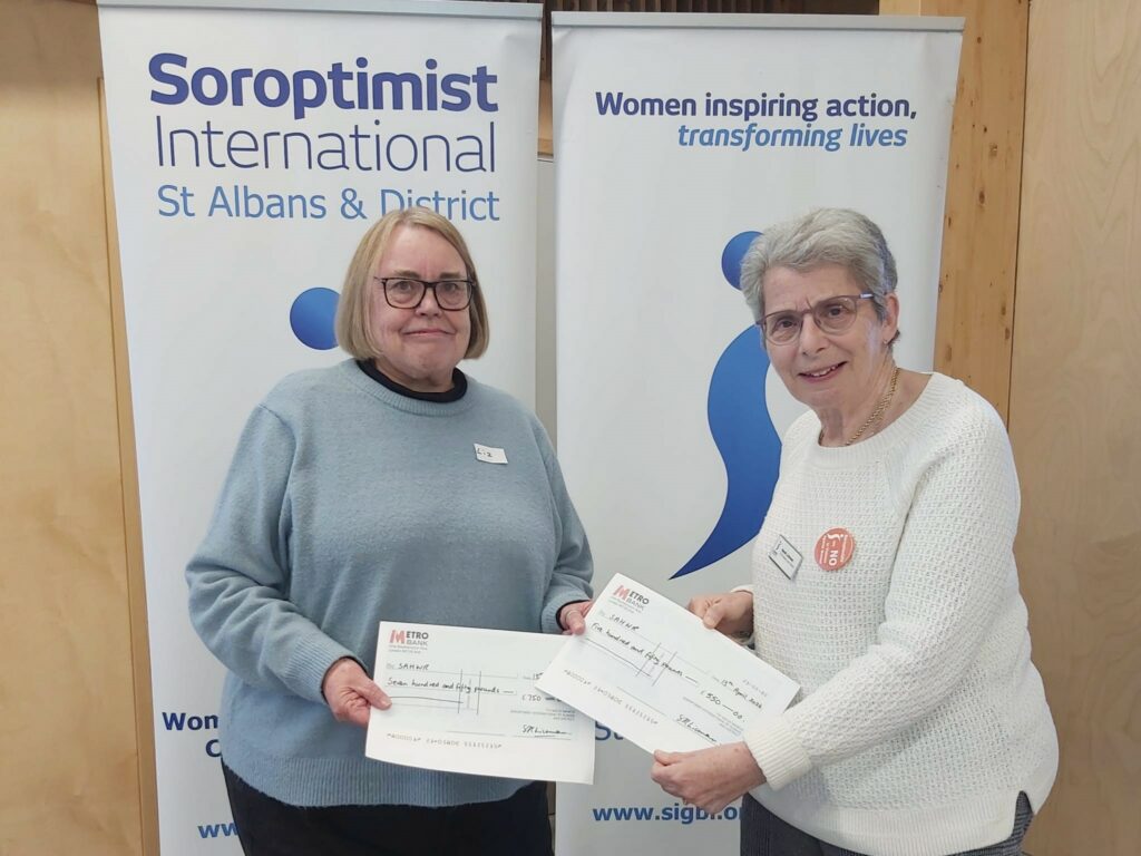 After the event SAHWR put this post on Facebook: “A huge thank you to the St Albans Soroptimists for the generous donations. Liz said, ‘it is always a privilege to meet with the Soroptimists who put a lot of their time and efforts into not only supporting SAHWR, but working to end Violence against Women and Girls.’ Once again, thank you for supporting us and we look forward to welcoming you to our new property where we can honour the late Jean Eaton with a cuppa and some cake!”